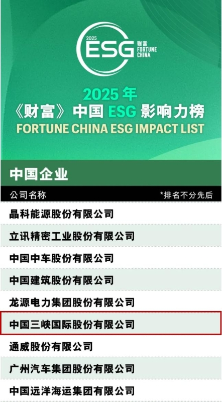 5月16日,備受矚目的《財富》中國ESG影響力榜正式揭曉,共100家企業入選。三峽國際憑借在環境、社會與公司治理(ESG)方面的卓越實踐連續第二年榮登該榜。
