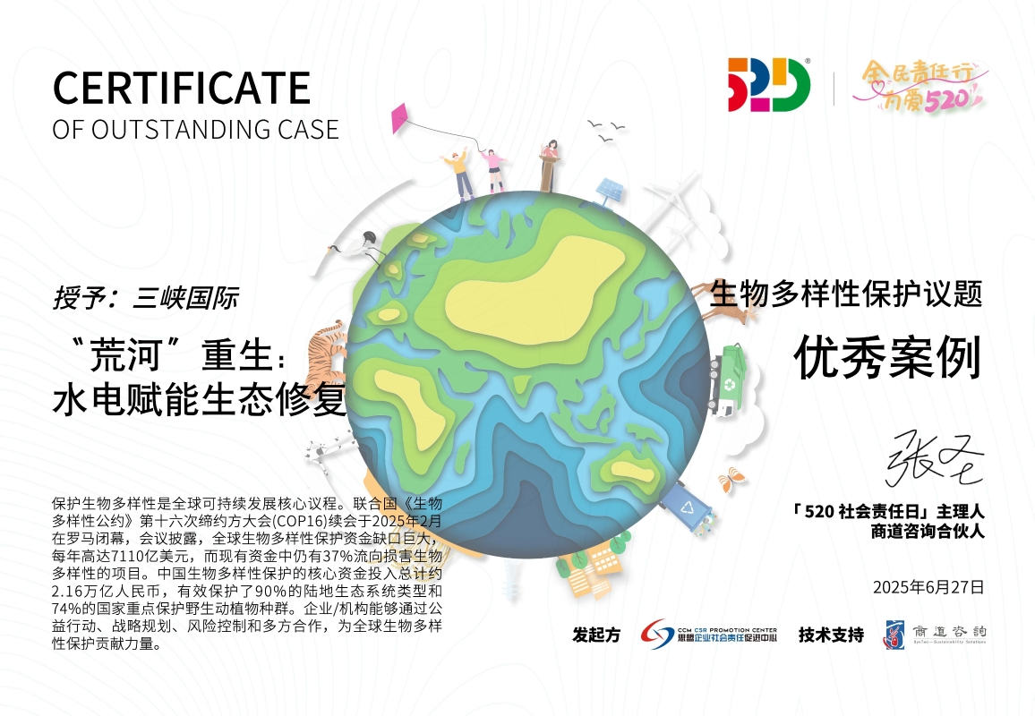 6月27日,由思盟企業(yè)社會(huì)責(zé)任促進(jìn)中心發(fā)起的2025年「520社會(huì)責(zé)任日」仲夏夜活動(dòng)在京成功舉辦。會(huì)上揭曉了2025年「520社會(huì)責(zé)任日」七大議題優(yōu)秀案例的評(píng)選結(jié)果,三峽國(guó)際連續(xù)第二年榮獲生物多樣性保護(hù)議題優(yōu)秀案例。